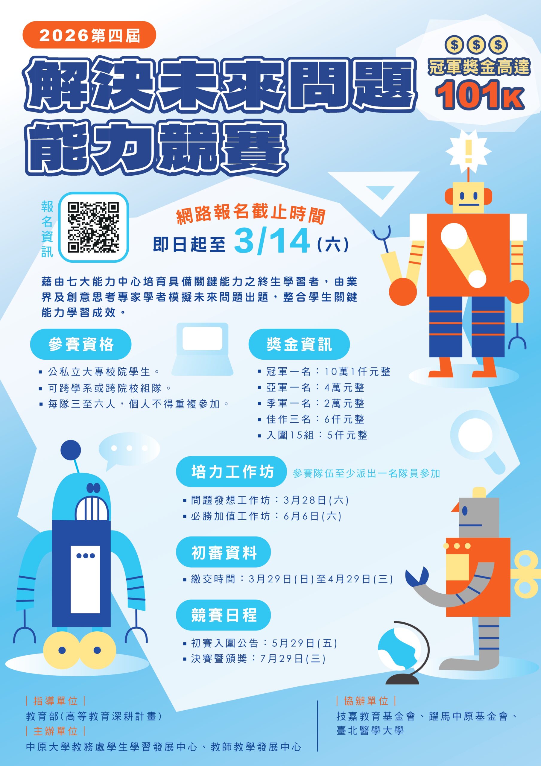 一、 報名日期:即日起至115年3月14日(星期六)止。 二、 參加對象:公私立大專校院學生。 三、 活動主題:解決未來問題能力競賽。 四、 活動資訊請詳閱:https://reurl.cc/dL4E1q。