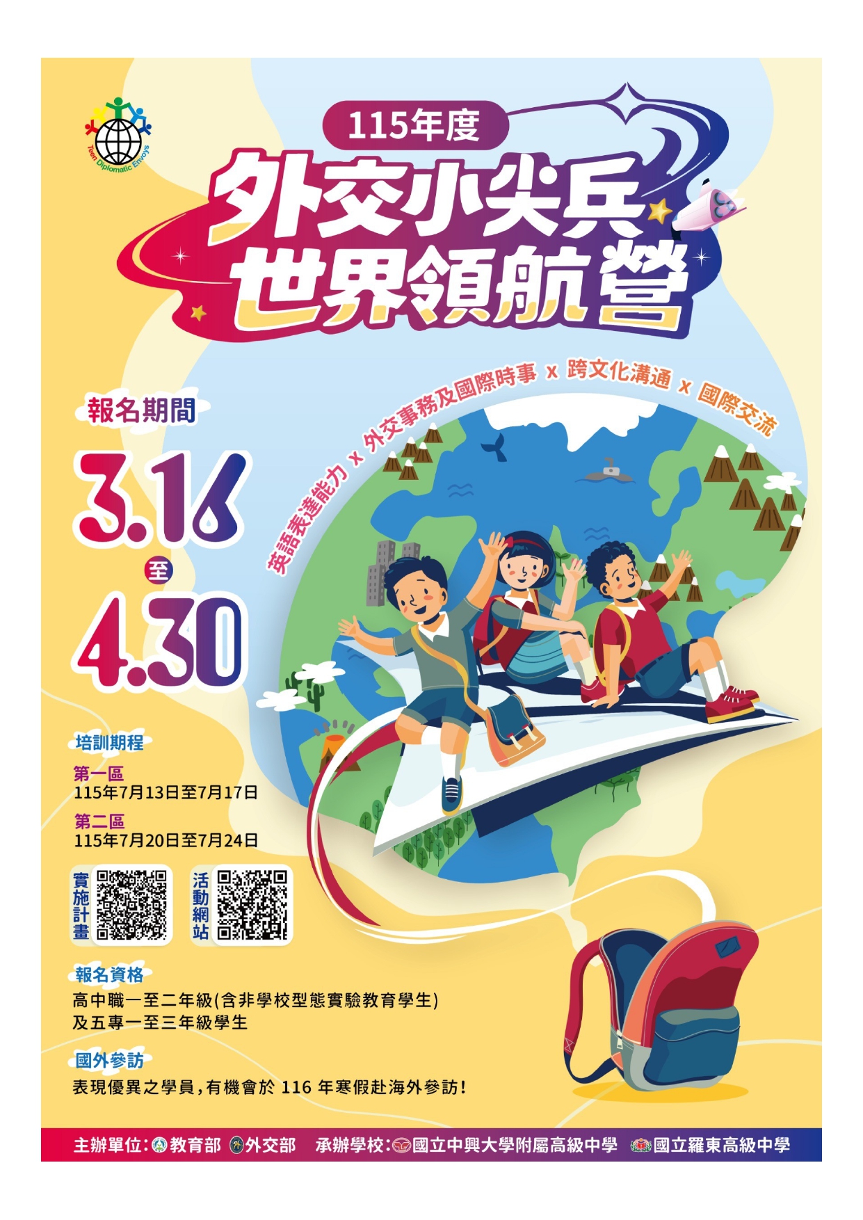2、原則請依就讀學校所在縣市分區報名,各區預計錄取84人,並各擇優遴選10人於116年寒假赴國外參訪。