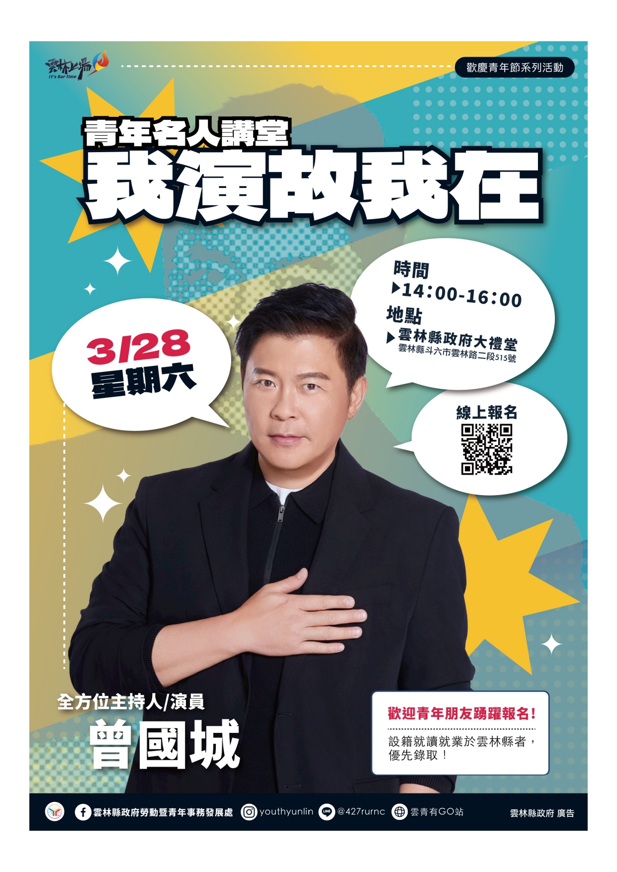 1、 活動主題:我演故我在。青年名人講堂係聚焦於百工百業有成人士自身領域的生活故事;本次邀請「金鐘主持人─曾國城」,分享職涯奮鬥的人生劇本。