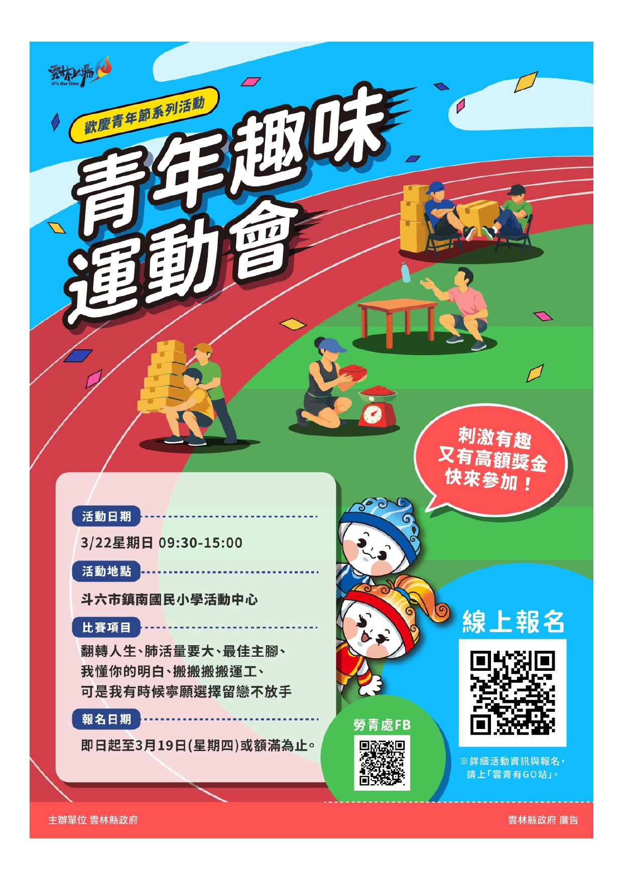 一、 雲林縣政府為歡慶青年節,特規劃辦理一系列活動,展現雲林縣年輕族群青春活力與落實青年培力。本年度系列活動資訊如下述: