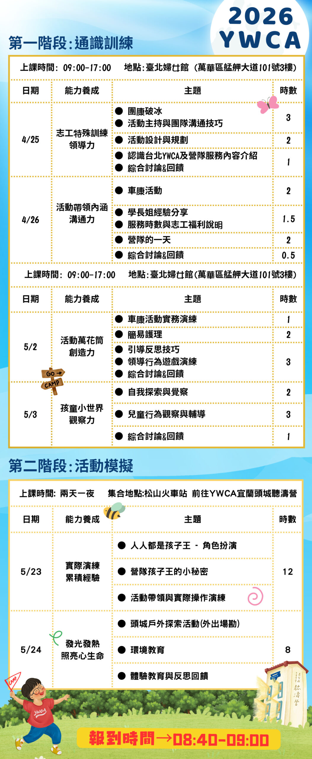 1.兒童營隊活動帶領及規劃 2.偏鄉小學服務 3.公益營隊服務 4.台北YWCA活動支援與協助