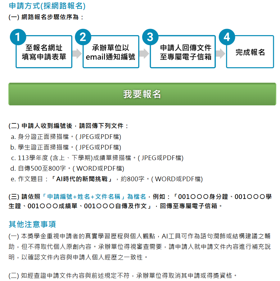 一、申請資格:就讀國內大學院校大眾傳播相關系所,大二以上在學學生,其113學年度學業及操行成績平均80分以上,始可申請。