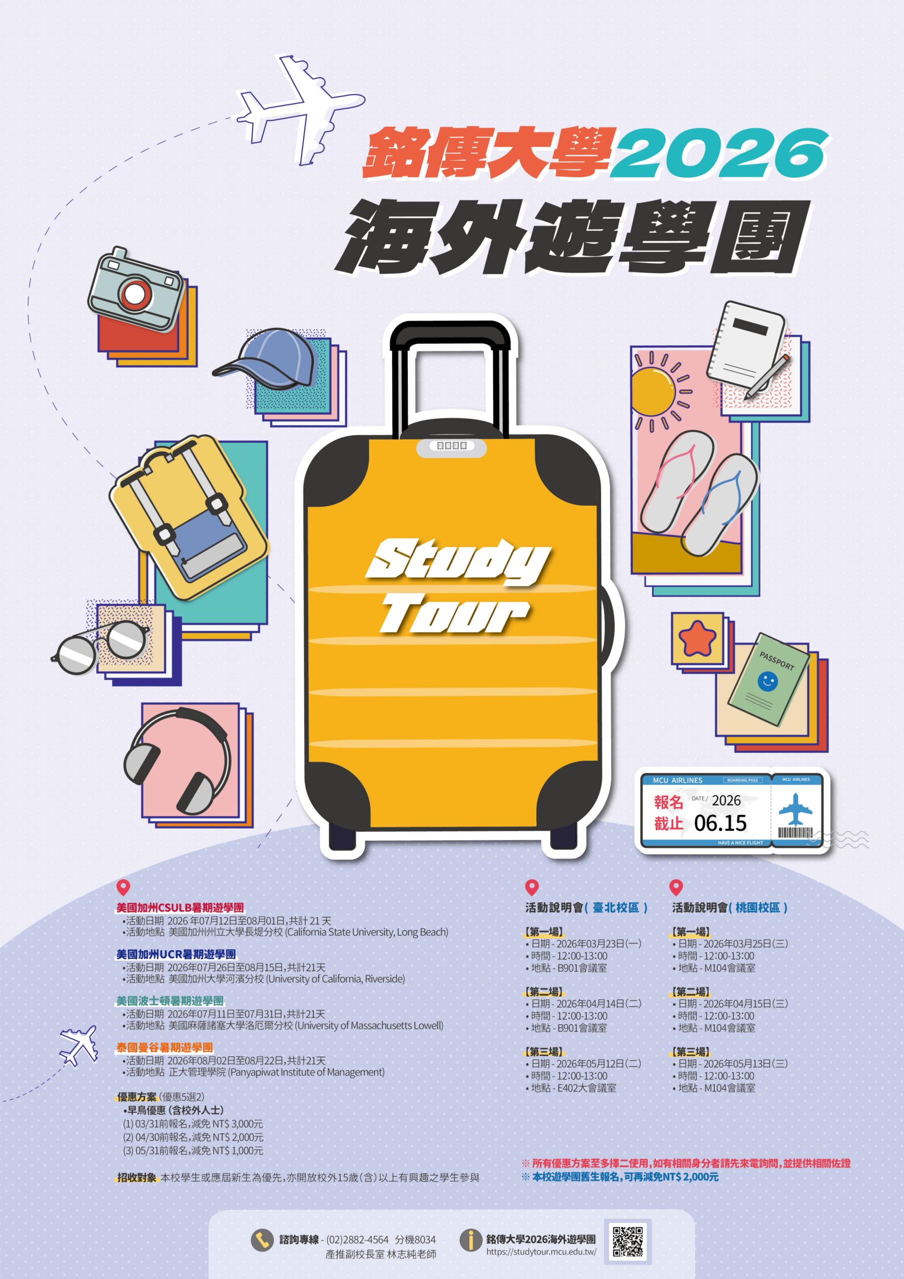 活動內容如下: (一)活動日期:115年7、8月。 (二)活動地點:美國加州州立大學長堤分校、美國麻薩諸塞大學洛厄爾分校及泰國正大管理學院。 (三)參加對象:全國大專院校在學生,英文能力不拘。 (四)活動網址:https://studytour.mcu.edu.tw/