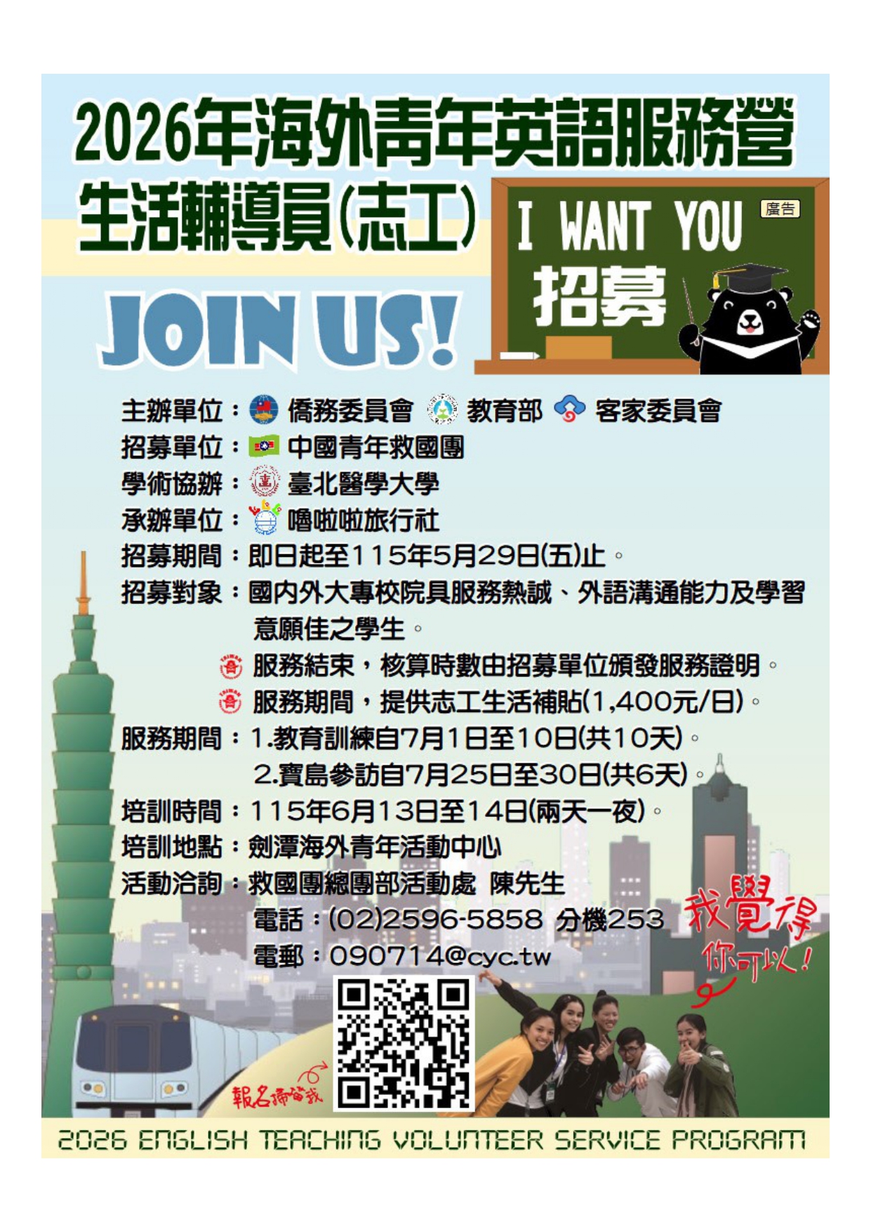 一、 本活動由僑務委員會、教育部國民及學前教育署及客家委員會共同主辦, 中國青年救國團為生活輔導員(志工)招募單位。