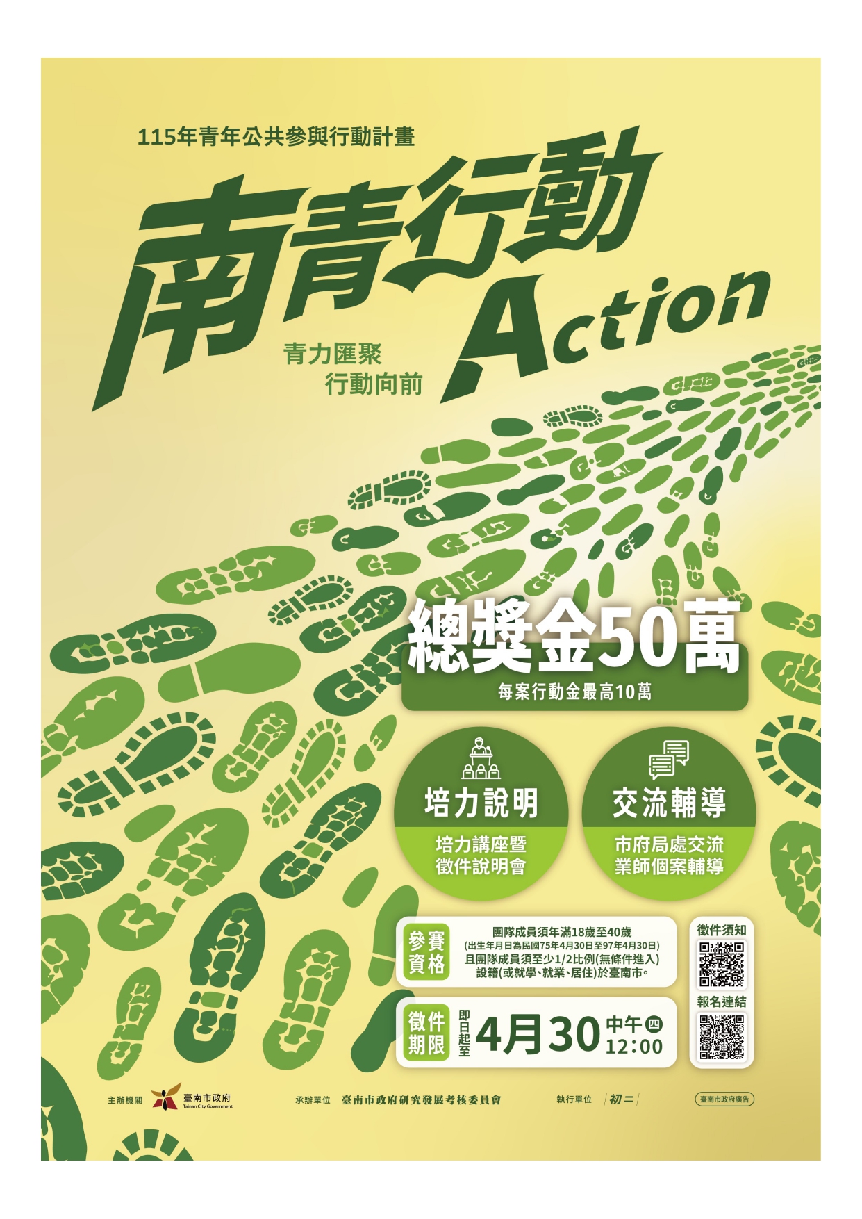 一、 此案招募青年團隊,以臺南市為應用場域,並以行政院「國家發展計畫(114至117年)」八大施政目標為主題,進行提案發想並付諸實際行動,原則擇優5案執行,每案最高給予10萬元行動獎勵金。