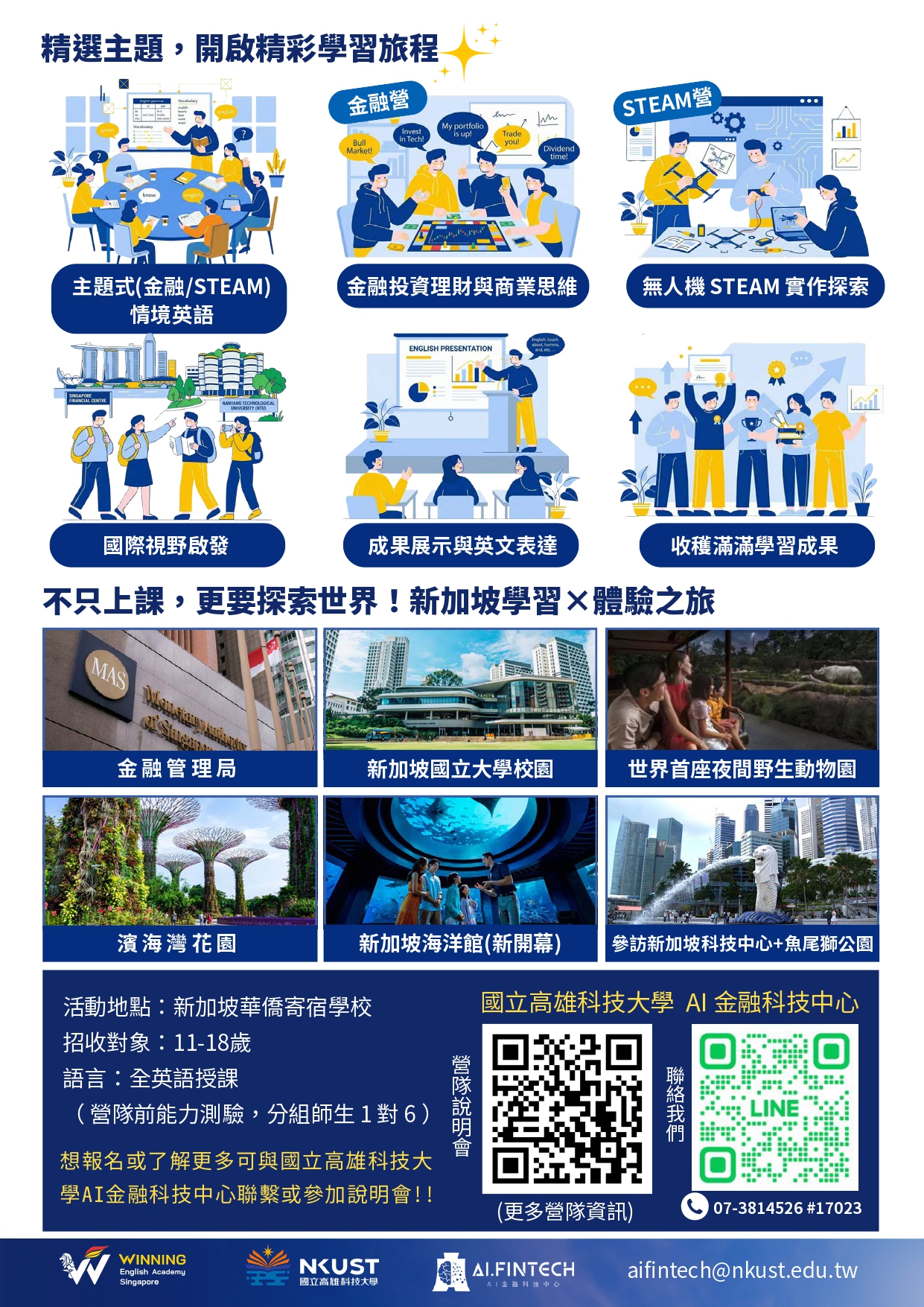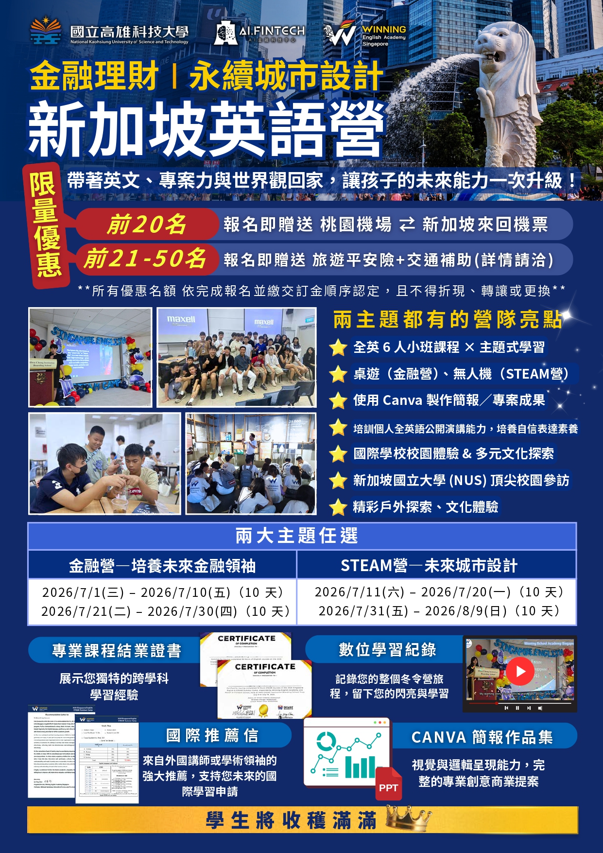 一、 為提升學生國際視野與英語實作能力,國立高雄科技大學AI金融科技中心與新加坡WINNING English Academy合作,於115年暑假辦理「2026 WINNING English 新加坡夏令營」,課程結合英語+金融素養及英語+STEAM專案設計,並融入跨文化交流與智慧城市探索,內容充實多元。