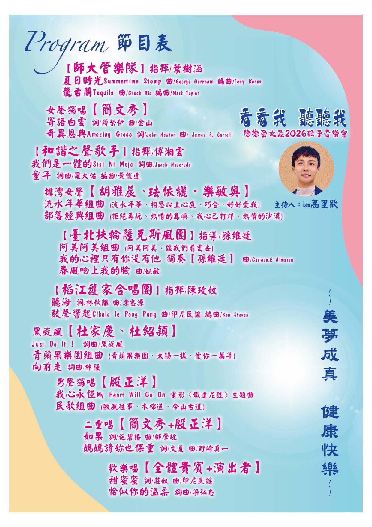 本次音樂會將由聲樂家簡文秀教授、殷正洋、孫維廷、黑旋風、排灣女聲、師大管樂隊、和諧之聲歌手、稻江護家合唱團、臺北扶輪薩克斯風團等團體共同演出,是為一場親子同歡的音樂會。