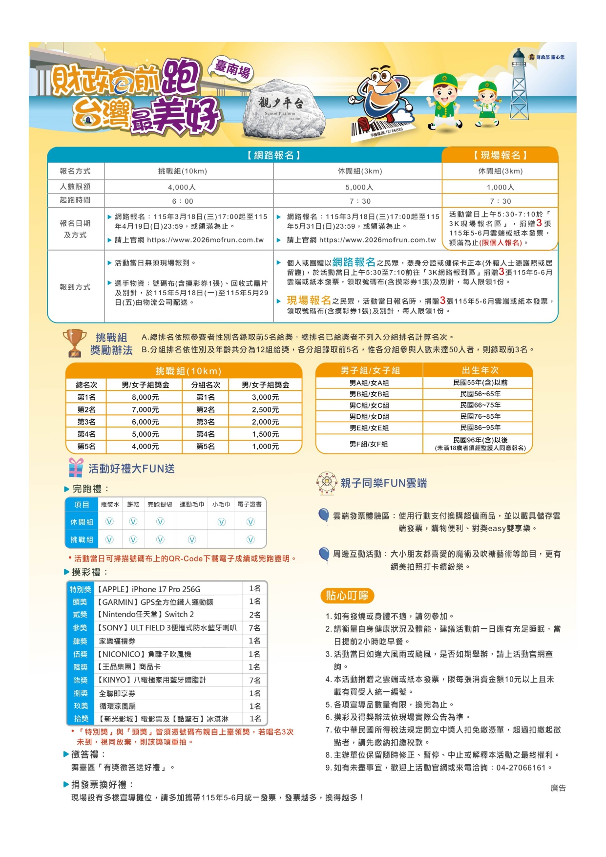 一、 內容請參見活動網站https://2026mofrun.com.tw/https://www.2026mofrun.com.tw、財政部南區國稅局Facebook粉絲專頁及本文附件。