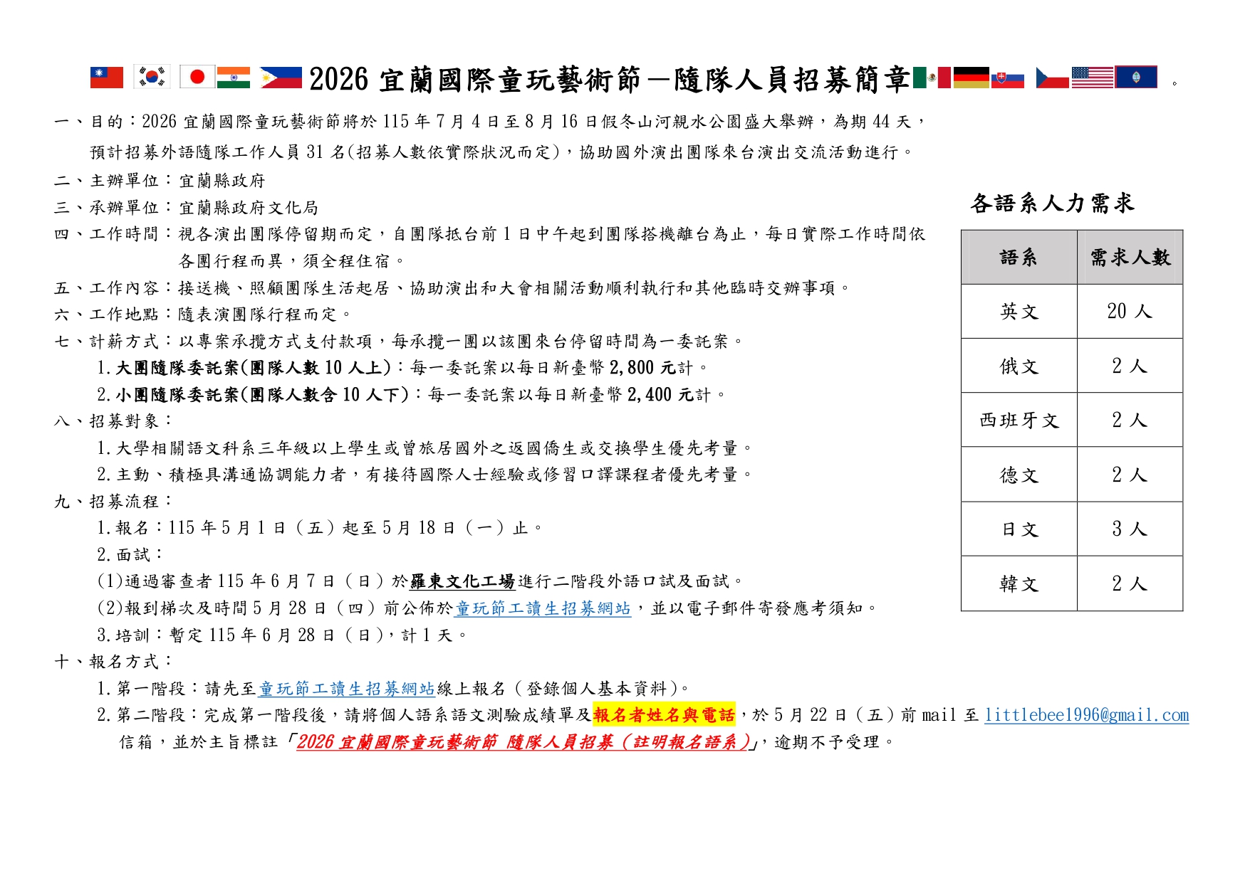 轉知《2026宜蘭國際童玩藝術節-短期工作人員及隨隊人員招募》