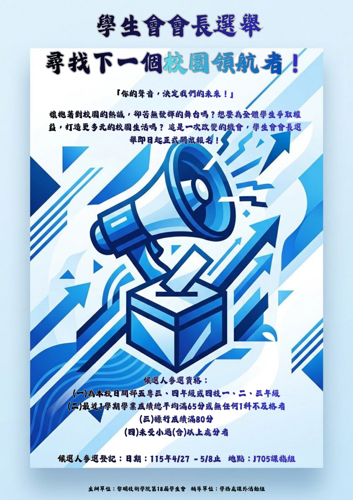 懷抱著對校園的熱誠,卻苦無發揮的舞台嗎?想要為全體學生爭取權益,打造更多元的校園生活嗎? 這是一次改變的機會,學生會會長選舉即日起正式開放報名!
