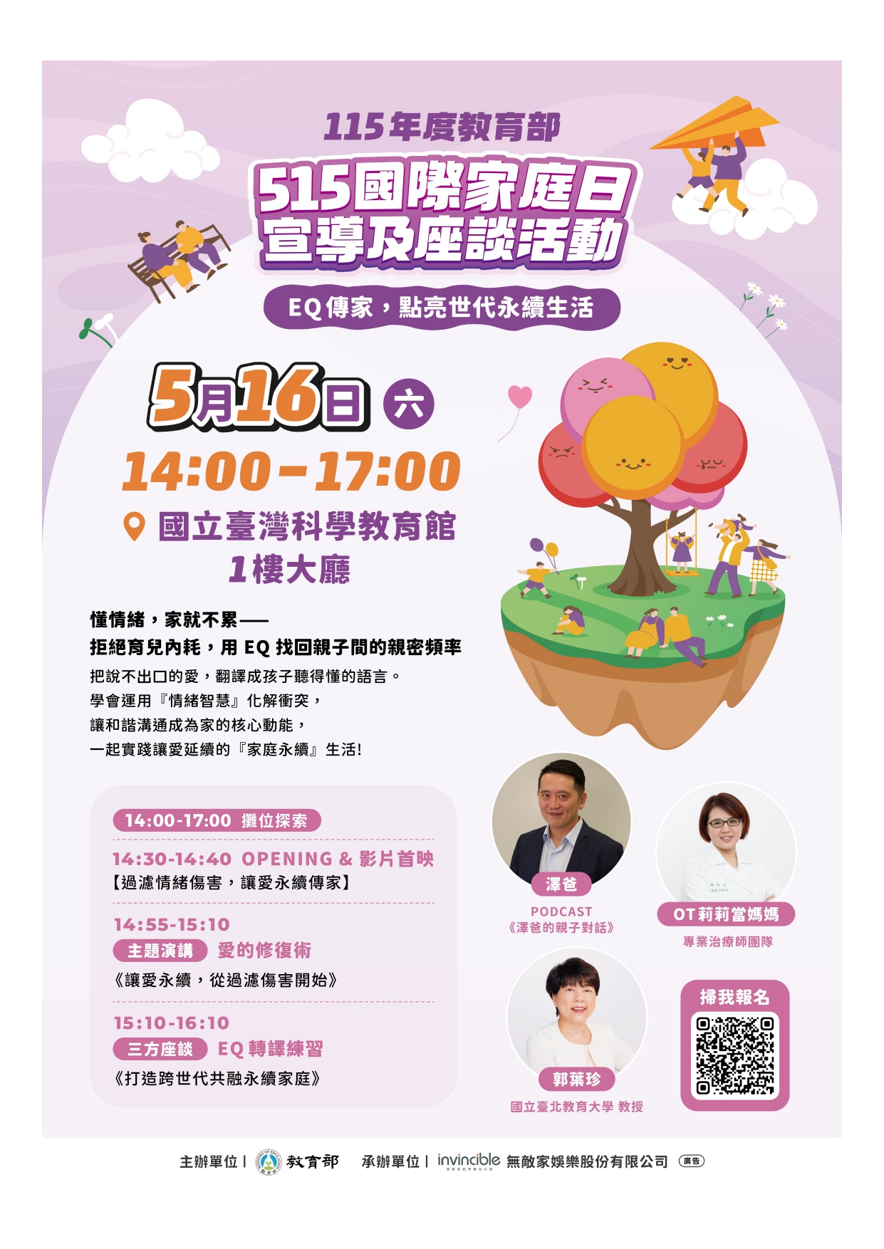 二、 此次活動訂於旨揭日期及地點,主題為「EQ傳家,點亮世代永續生活」,將以邀請學術代表、親職專家與親子教育專家進行三方座談會為主軸,配合闖關活動、表演節目等方式,宣導「情緒溝通」及「親子互動」之內涵。
